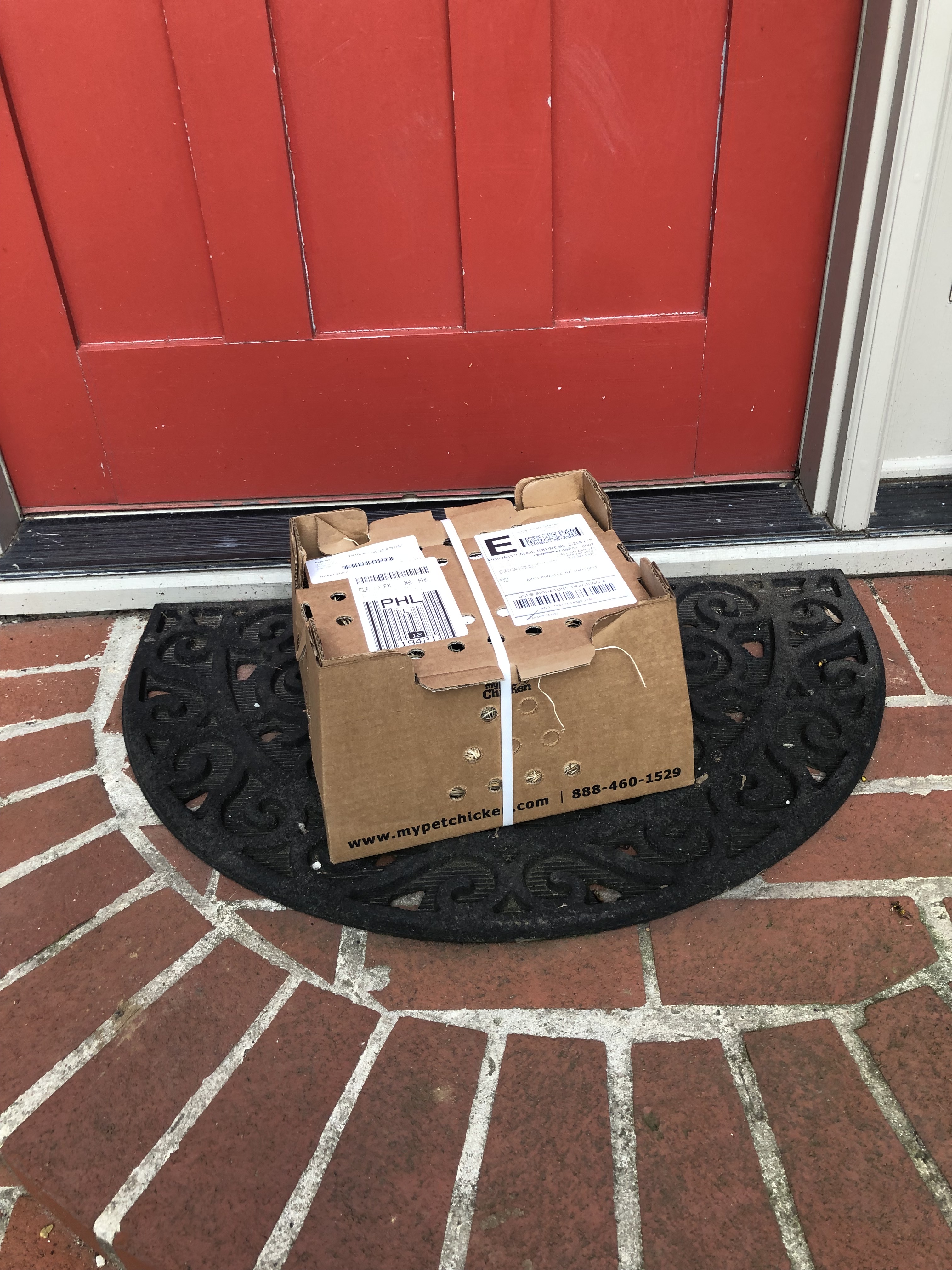 My Pet Chicken, the online site I got my chickens from, again came through with flying colors just as they had in the past; ALL 8 made it in good health, nestled in lots of “stuffing” with a heating block to keep them warm.