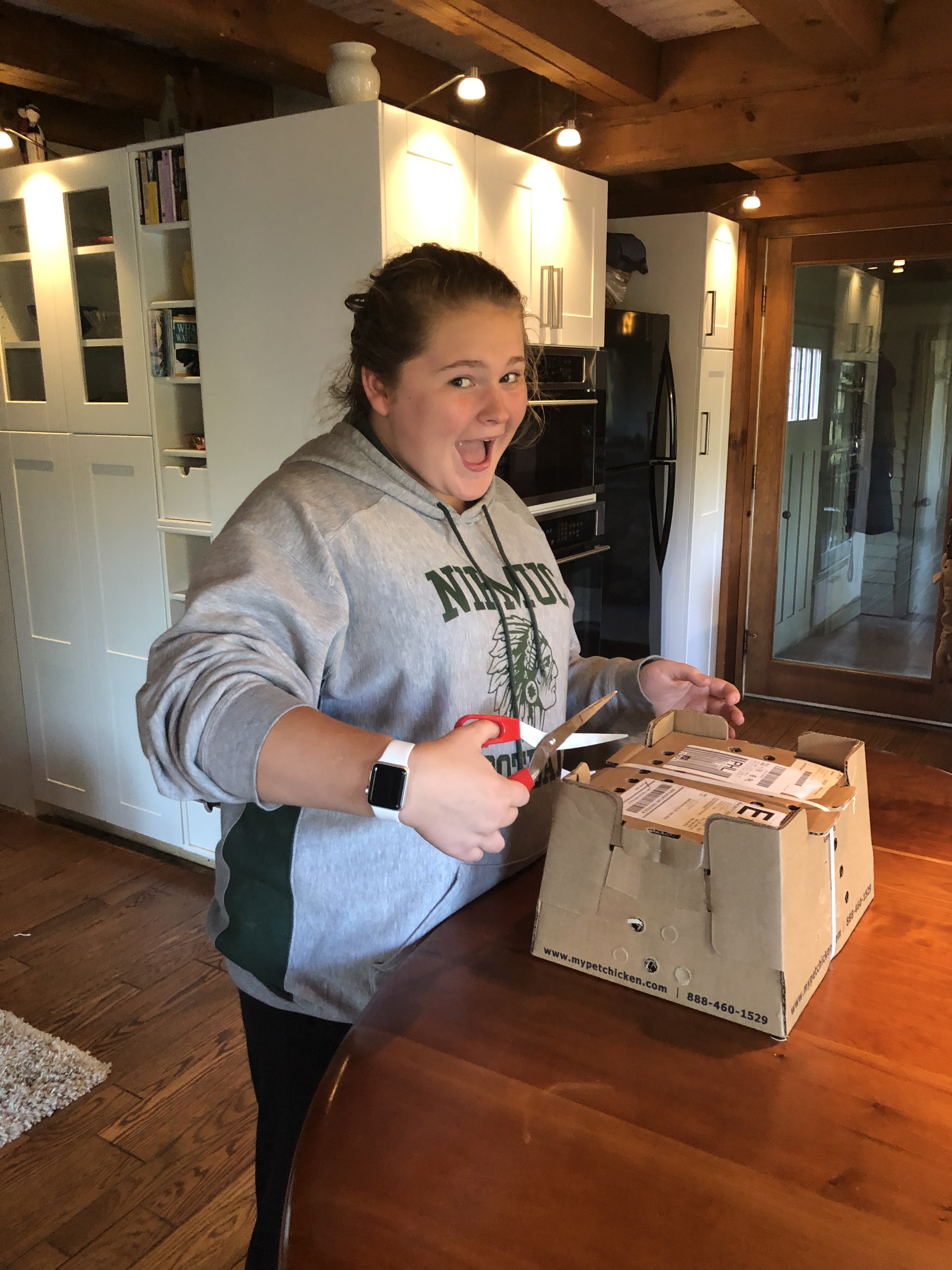 When the message that the chicks had been delivered to our post office came as the clock struck 5 pm I literally RAN up our hill to see if by chance postmaster Steve was staying open late waiting for me. He did better than that, he arrived at my driveway at the same time I was getting into my car. He carefully handed over a box and I was delighted when I heard the faint peeps from inside- there were at least several that had made the trip. My daughter noticed the commotion from upstairs and opened the window shouting “wait for me- don’t open it without me!” (Our dedicated postmaster did receive a well deserved plate with cookies for his efforts the following week!)