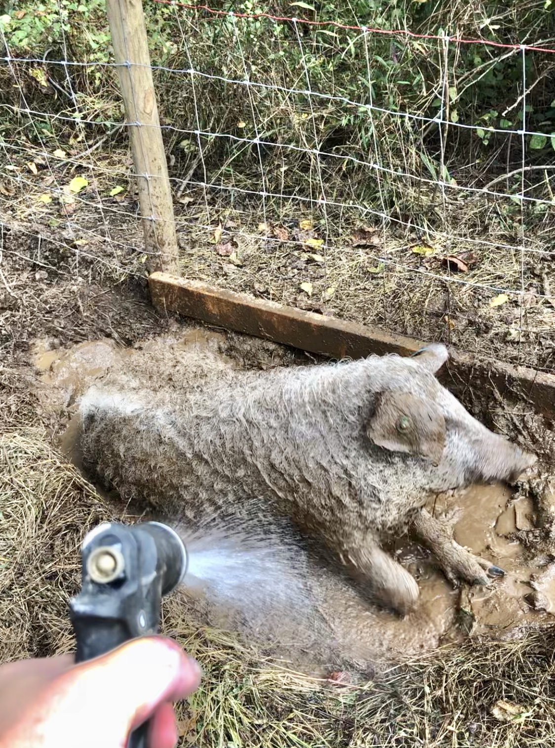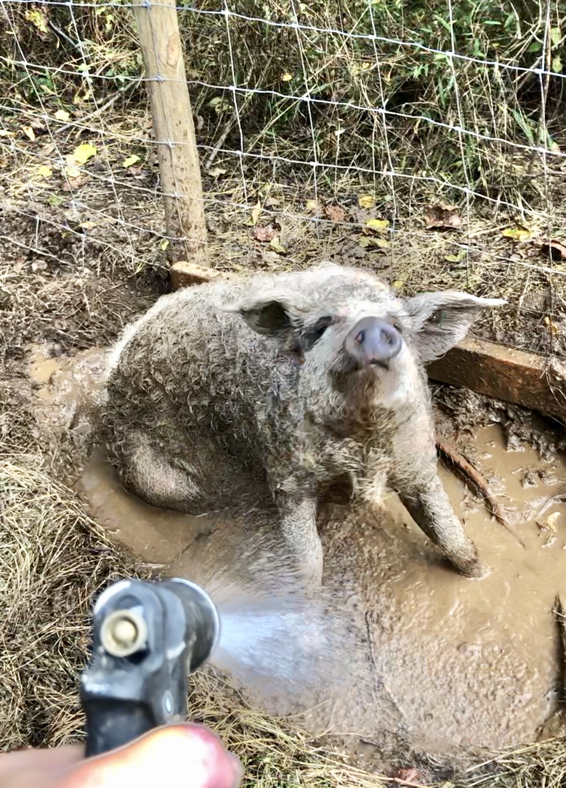 I can at this time not decide what I enjoy the most: seeing my pigs come running towards me when they see me or hearing the sheep baaing as I approach while sticking their noses out through fence to sniff me and give me kisses- well that’s what I tell myself- most likely they are looking for treats! I did not know that the pigs play as much as they do. Otto and my little Cockapoo enjoy running back and forth on each side of the fence, chasing each other back and forth, with short stops of coming nose to nose. The two little girls, who I think are growing quickly for being a slow-growing breed, often play with each other as well, pushing and nuzzling each other, running around in circles and throwing themselves down. When rubbed, they all lean into my hand and slowly sink down, laying on their side with their eyes closed. And if you really want to see a pig smile, provide them with a hole filled with water for them to roll around and splash in!!
