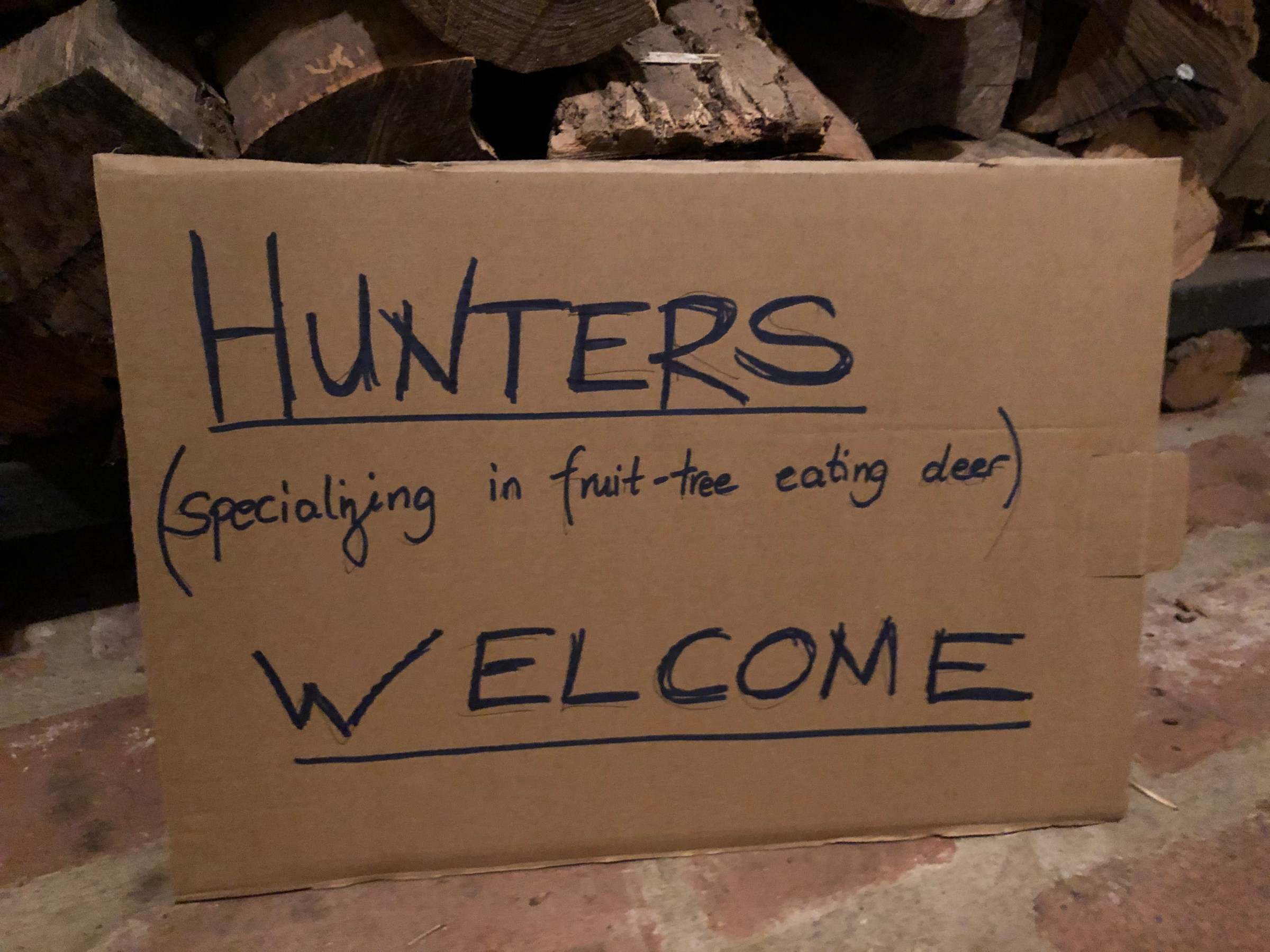 Today I walked out in my back yard/budding fruit tree orchard only to discover that I had several damaged trees. I was devastated and heart broken as I every day look at my trees since they make me happy (It really is the small things). I studied the damage with concern; broken branches, scraped up bark and one tree completely broken, before I resolutely walked back inside. I quickly made my self a sign fully intending to post it at the side of the road. It read “HUNTERS WELCOME”.