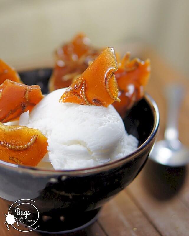 4. Pour Immediately pour hot toffee all over mealworms and parchment paper, in the baking sheet. Pick up baking sheet and rotate slowly, so toffee will thin and spread out. Set aside to cool for approximately 10-15 minutes. When completely cooled, break toffee into shards and enjoy, preferably as a topping on ice cream or cake. If you will not be consuming the mealworm toffee immediately, it will keep for 1 day stacked between layers of wax paper.