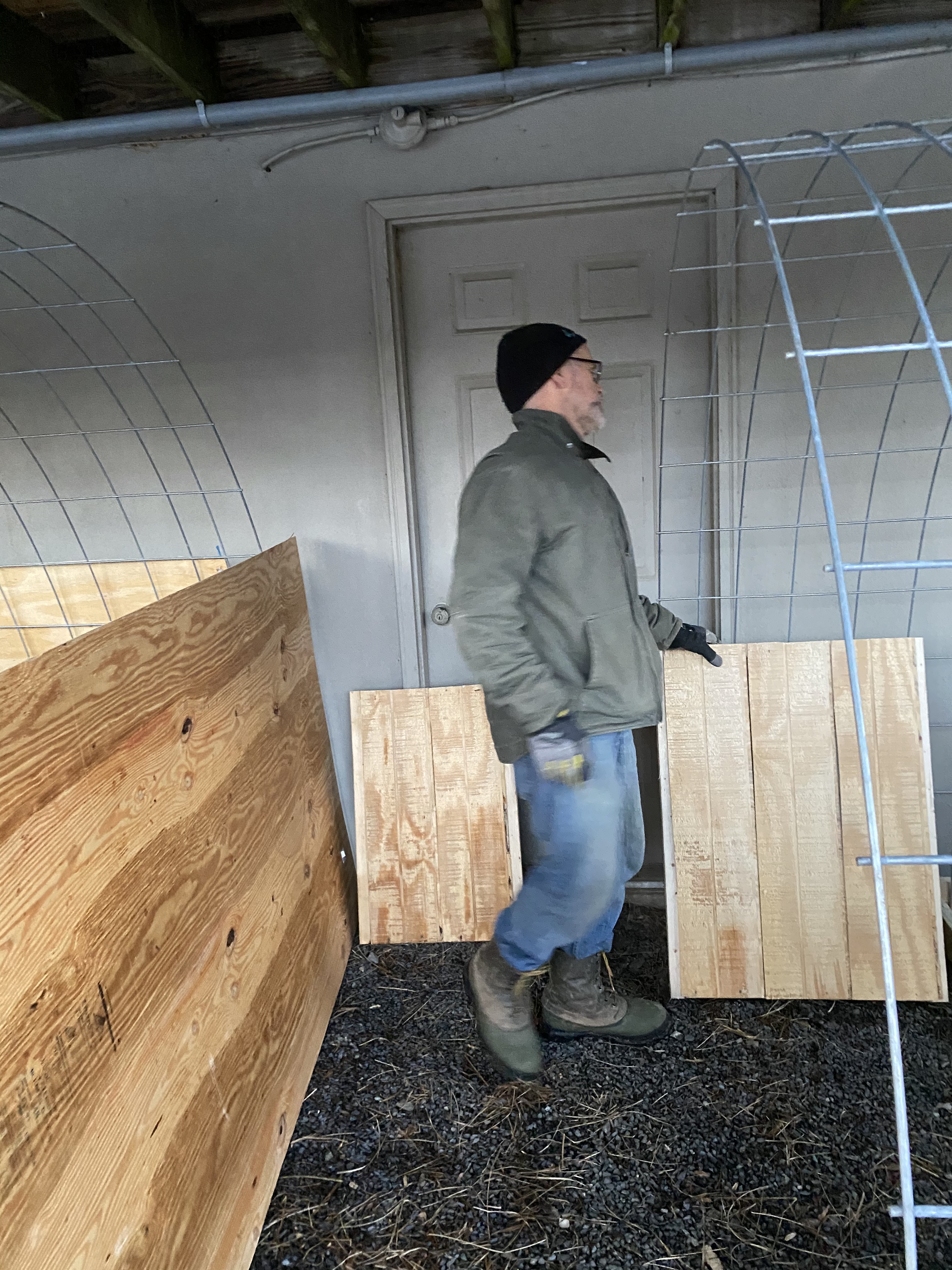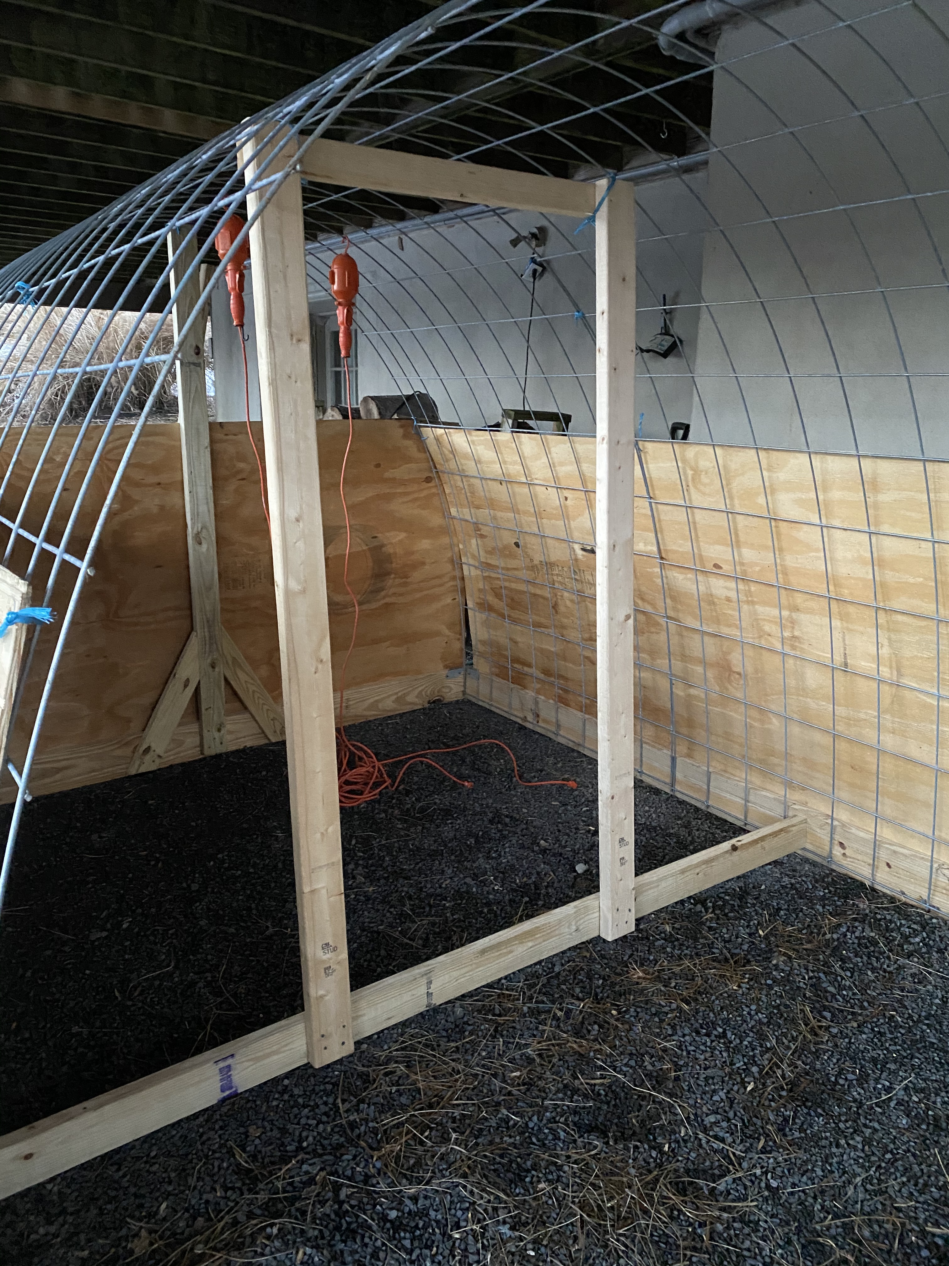 I should probably call it lambing weekend, not season, but since I had one that was bread almost 2 months later I’m still calling it season! Since we are AI:ing (artificially inseminating) we have the luxury of being able to pretty much pinpoint when our ewes are due. In spite of that, the official due date came… and went. As did the next day. My poor little ewe who had had a vaginal prolapse a month before was being watched over in hawk-like manner so we could remove the stich (more of like a 5mm band) that was put in to prevent her from prolapsing again. The same stitch would also would prevent her from lambing if it wasn’t taken out when needed. Our vet had painted a horror picture if we weren’t able to remove it in time. If we took it out too late, or missed her labor she could be ripping everything apart damaging herself severely and potentially lose the lamb. If it was taken out too early she risked prolapsing again prior to delivering. If that happened the prolapse would prevent the lamb from being born and she would need to get to the animal hospital an hour away for an emergency c-section. There was also risk of her uterus prolapsing after the lamb was born. Non of these scenarios were ok with me, and I was “a little” frantic. In order to be able to monitor properly the sheep were all moved up top to temporary lambing pens under our deck over nights. I spent the nights on the couch checking the ewes every or every other hour. Thankfully Scott is a master at whipping up necessary shelters as we need them. They ended up with roomy and large lambing pens! In the pictures you can see the pens as they are getting built, with the door in the middle. This set up gave us 3 areas, so they could see each other and / or be separated as needed.